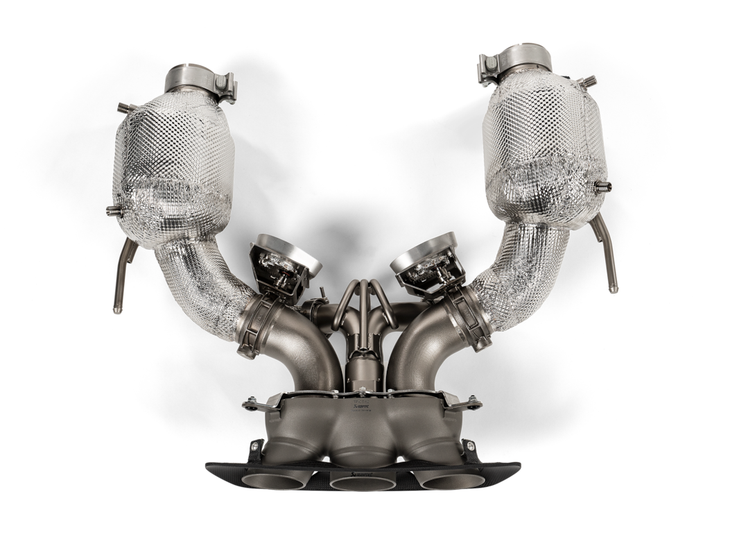 In plaats van de standaard benzinepartikelfilters worden er twee 200 cpsi sportkatalysatoren toegepast. Deze zorgen voor een directe en efficiënte gasafvoer met verminderde tegendruk. De unieke kleppen, gegoten in Akrapovič’ eigen foundry, zijn specifiek afgestemd op de 120° V6-motor en leveren een diepe, resonerende sound bij het starten en een rauwe, race-achtige klank bij hogere toerentallen.